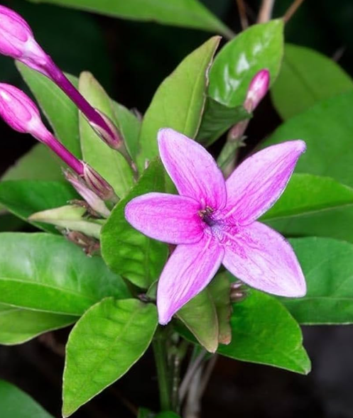 Tagar 'Pink Tint' (Tabernaemontana divaricata 'Pink Tint'), a South Asian evergreen shrub, grows 1.5-1.8 m with moderate growth in well-drained sandy-loam, thrives in full sun to partial shade, requires moderate watering, is non-edible with sedative and anxiolytic benefits, and produces year-round white flowers with a subtle pink tint.