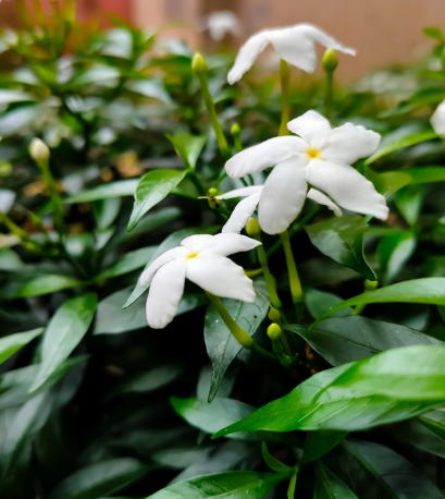 Tagar 'Rainforest' (Tabernaemontana divaricata 'Rainforest'), a South Asian evergreen shrub, grows 1.8-2.4 m with moderate growth in well-drained sandy-loam, prefers partial shade with higher moisture, is non-edible with sedative and anxiolytic benefits, and produces year-round white flowers in a lush, rainforest-like setting.