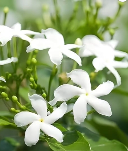Tagar 'Royal White' (Tabernaemontana divaricata 'Royal White'), a South Asian evergreen shrub, grows 1.5-2 m with moderate growth in well-drained sandy-loam, thrives in full sun to partial shade with moderate moisture, is non-edible with sedative and digestive benefits, and produces year-round regal white flowers.