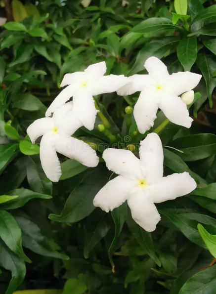 Tagar 'Twisted Petal' (Tabernaemontana divaricata 'Twisted Petal'), a South Asian evergreen shrub, grows 1.5-1.8 m with moderate growth in well-drained sandy-loam, thrives in full sun to partial shade, requires moderate watering, is non-edible with sedative and anxiolytic benefits, and produces year-round white flowers with uniquely twisted petals.