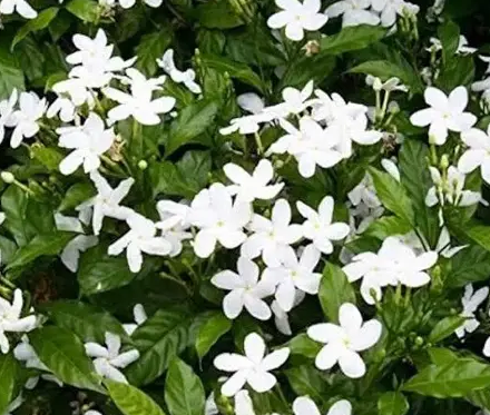 Tagar 'Urban Charm' (Tabernaemontana divaricata 'Urban Charm'), a compact South Asian evergreen shrub, grows 0.9-1.5 m with slow to moderate growth in well-drained loamy soil, thrives in full sun to partial shade, requires moderate watering, is non-edible with sedative and anxiolytic benefits, and produces year-round white flowers ideal for urban settings.
