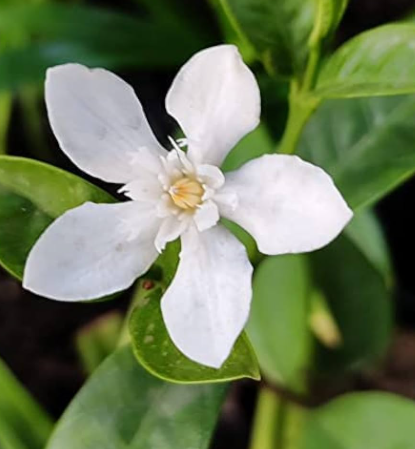 Tagar 'Valley Snow' (Tabernaemontana divaricata 'Valley Snow'), a South Asian evergreen shrub, grows 1.2-1.8 m with moderate growth in well-drained loamy soil, prefers partial shade with moderate moisture, is non-edible with sedative and anxiolytic benefits, and produces year-round pure white flowers suited for cooler valley climates.