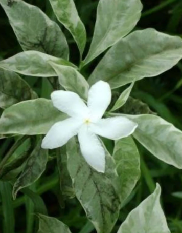 Tagar 'Variegata' (Tabernaemontana divaricata 'Variegata'), a South Asian evergreen shrub, grows 1.5-1.8 m with moderate growth in slightly acidic well-drained soil, thrives in full sun to partial shade, needs moderate moisture, is non-edible with calming and bactericidal benefits, and blooms year-round with fragrant white flowers and variegated leaves.