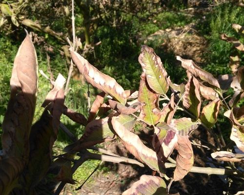 Browning and wilting of the leaves, discolouration of the stem and death of the branches .