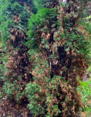Leaf discoloration, root decay, powdery coating, rusty spots, branch dieback