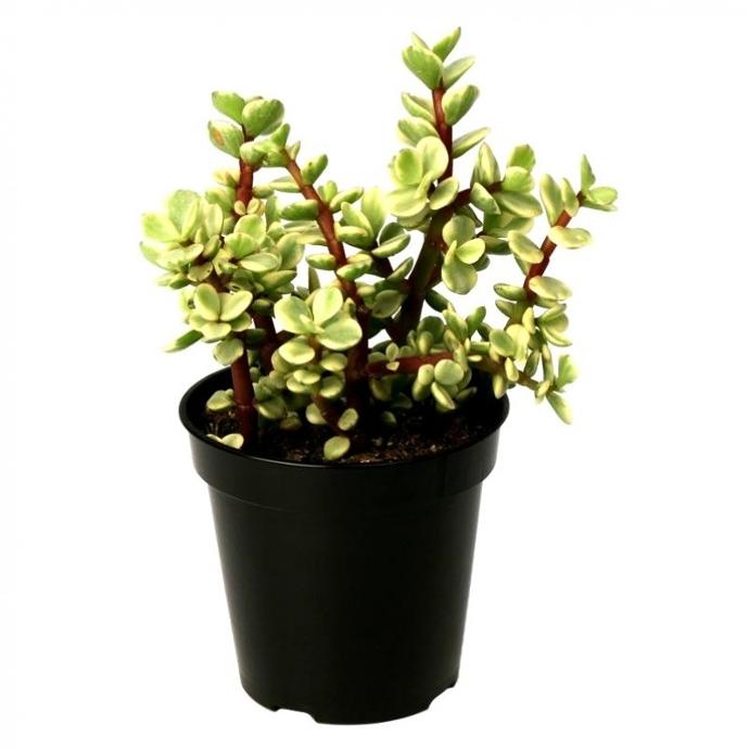 Variegated Jade (Crassula ovata), also known as Money Plant or Jade Plant, is a succulent often grown in hanging baskets. Plant in well-draining soil and provide bright, indirect light. Allow the soil to dry between waterings. Pruning can be done to control the size and shape of the plant.