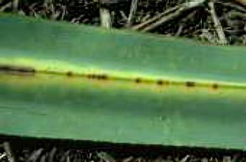 Necrotic spots appear on the leaf.