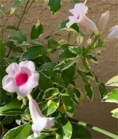 A decorative shrub with yellow/white trumpet-shaped flowers and variegated leaves. Grows well in full sunlight with moderate water requirements. |