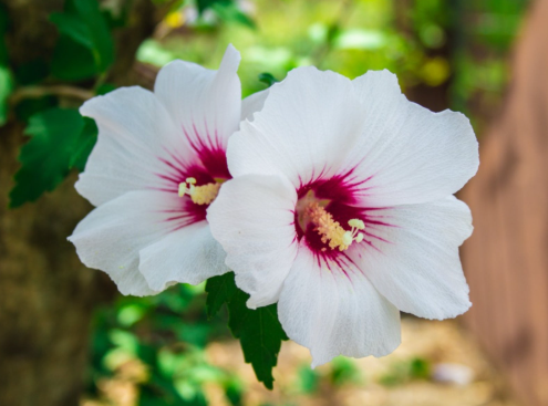 White Hibiscus (Hibiscus rosa-sinensis, white cultivar), a fast-growing evergreen shrub from Asia, reaches 1-3 m in loamy soil under full sun to part shade, producing 50-100 white flowers year-round with edible flowers used for anti-inflammatory and antioxidant benefits.