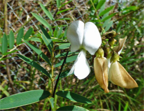 White Hoarypea (Tephrosia candida) grows up to 3 ft, thrives in well-drained soil, full sun, moderate moisture, and is edible but not medicinal.