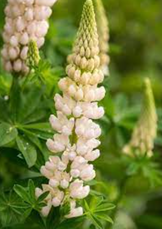 White Lupin (Lupinus albus), a moderate-growing herb up to 3 ft, thrives in loamy soil, full sun, moderate moisture, and is both edible and medicinal.