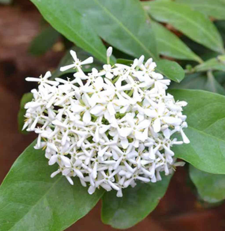 White Star (Ixora 'White Star'), a tropical evergreen hybrid shrub, grows 1.2-1.8 m with moderate growth in well-drained acidic soil, thrives in full sun to partial shade with moderate to high moisture, is non-edible with no medicinal benefits, and produces white flower clusters year-round.