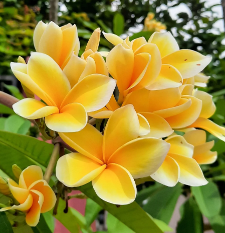 Yellow Bird (Plumeria rubra 'Yellow Bird'), a deciduous tropical shrub/tree, grows 2.4-4.8 m with moderate growth in well-drained sandy soil, thrives in full sun with moderate moisture, is non-edible with no medicinal benefits, and produces 3-3.5 inch bright yellow flowers with a citrusy fragrance in summer-fall.