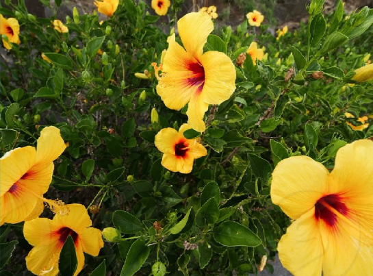 Yellow Hibiscus (Hibiscus rosa-sinensis, yellow cultivar), a fast-growing evergreen shrub from Asia, reaches 1-3 m in loamy soil under full sun to part shade, producing 50-100 yellow flowers year-round with edible flowers used for anti-inflammatory and antioxidant benefits.