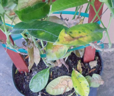 Brown spots or lesions on the leaf veins , leaf drop may occur .